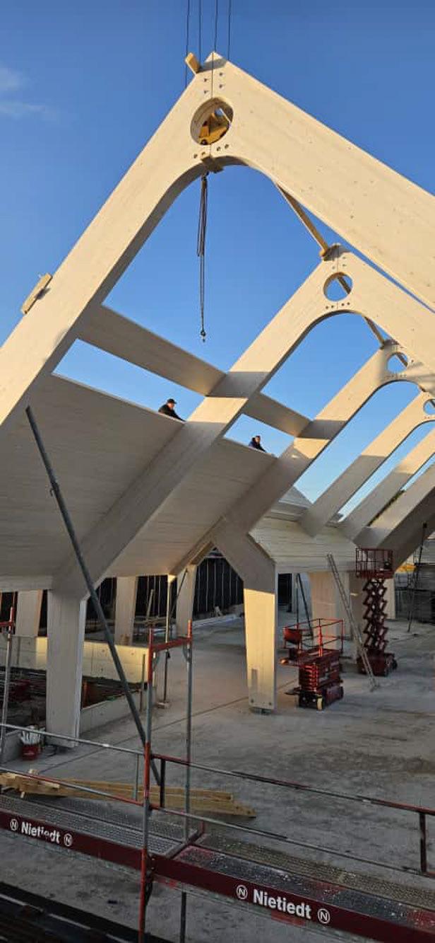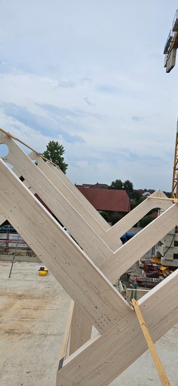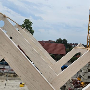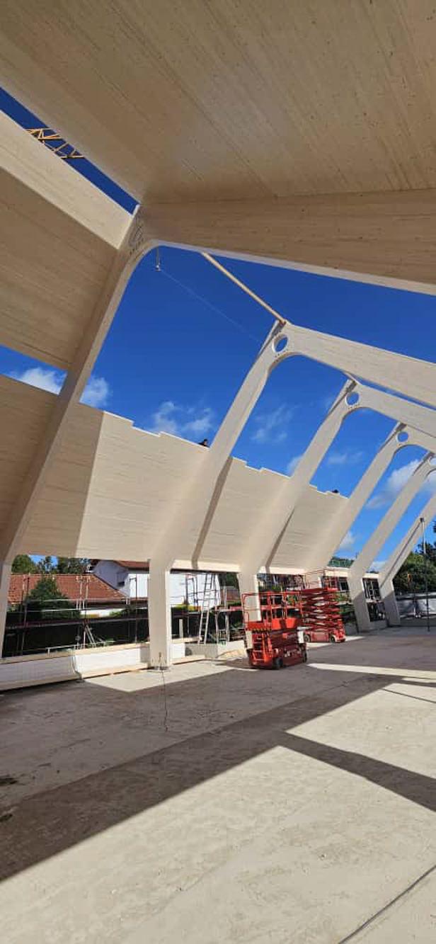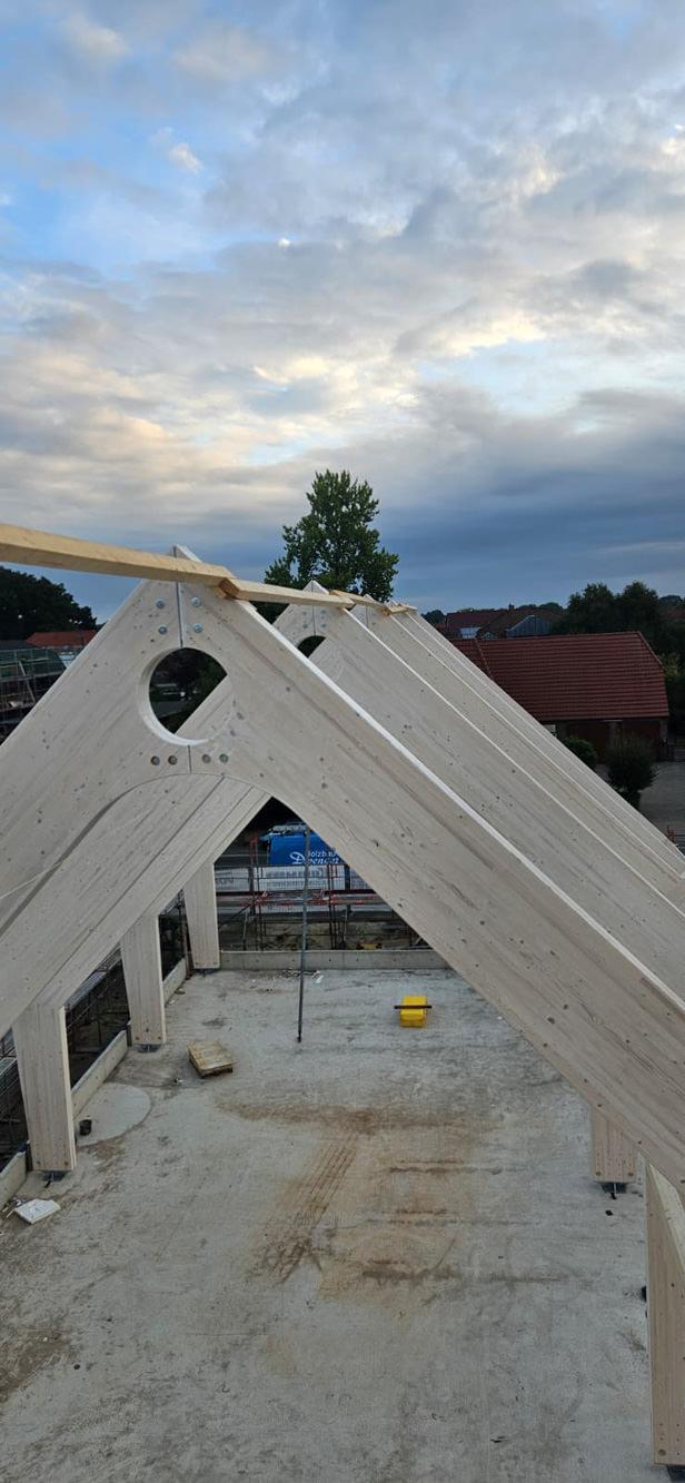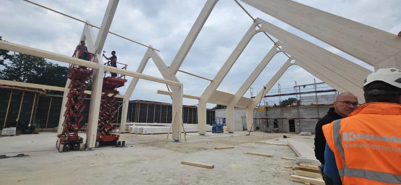 Besonderheit: Sichtbare Brettschichtholz-Binder und ökologische Hybridbauweise.