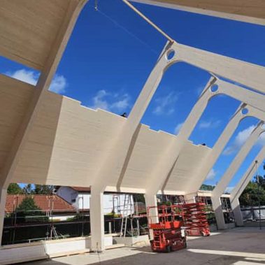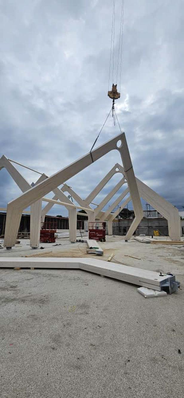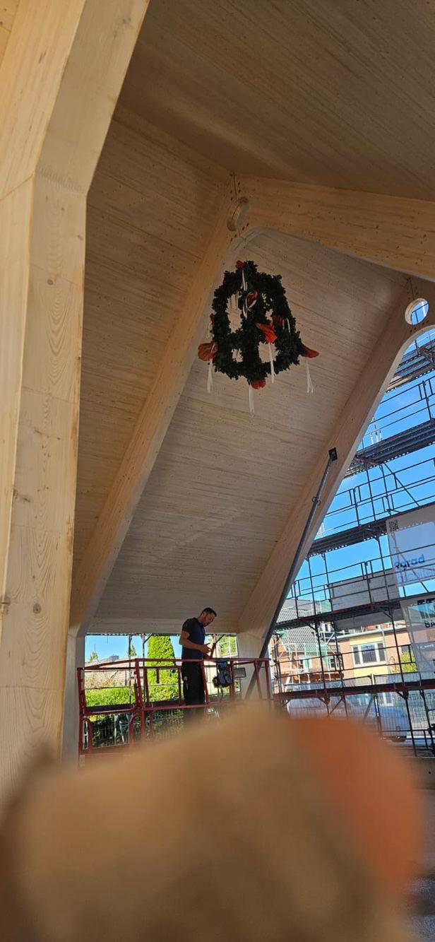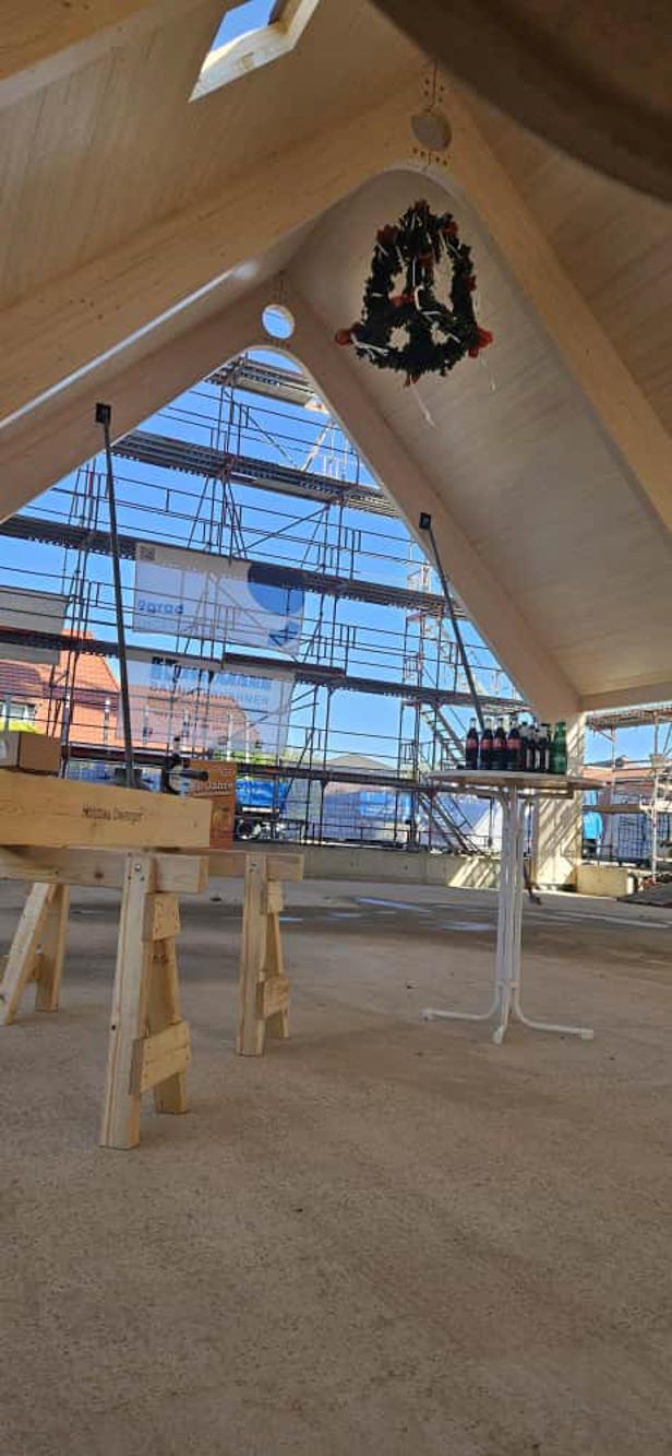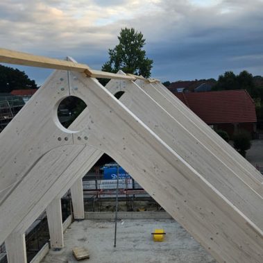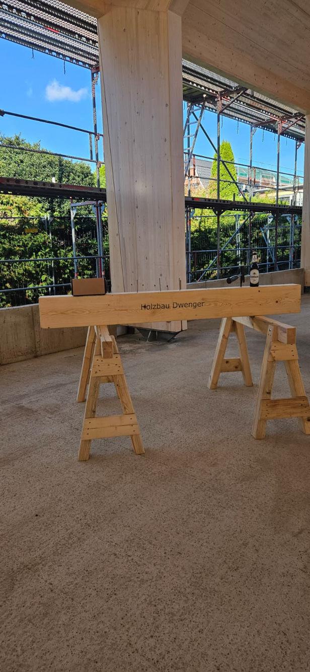 Besonderheit: Sichtbare Brettschichtholz-Binder und ökologische Hybridbauweise.