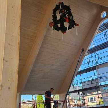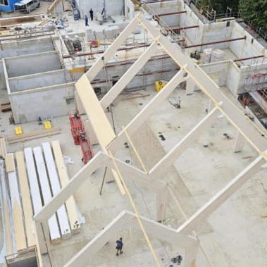 Vollholzdecken: Montage massiver Deckenelemente, die Ästhetik mit hohem Brandschutz und Stabilität verbinden.