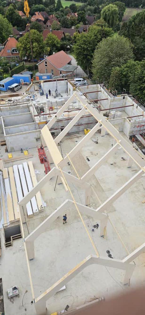 In Wardenburg entsteht derzeit ein zukunftsweisender Aktiv & Irma Markt, bei dem wir die umfangreichen Holzbauarbeiten übernehmen. Das Projekt wird in zwei Teilabschnitten realisiert, was eine präzise Logistik und Koordination erfordert.