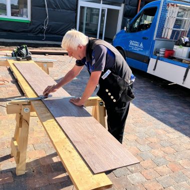Fachgerechte Montage: Millimetergenauer Zuschnitt und Anbringung der HPL-Platten für ein harmonisches Fugenbild.