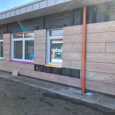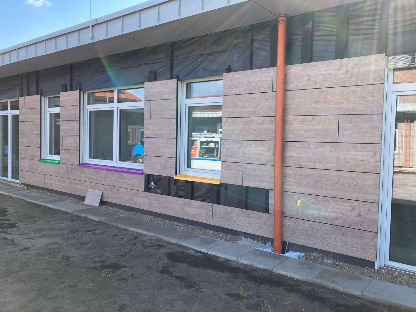 Besonderheit: Hinterlüftete Fassade mit hoher Stoßfestigkeit – ideal für den Außenbereich von Schulen und Kitas.